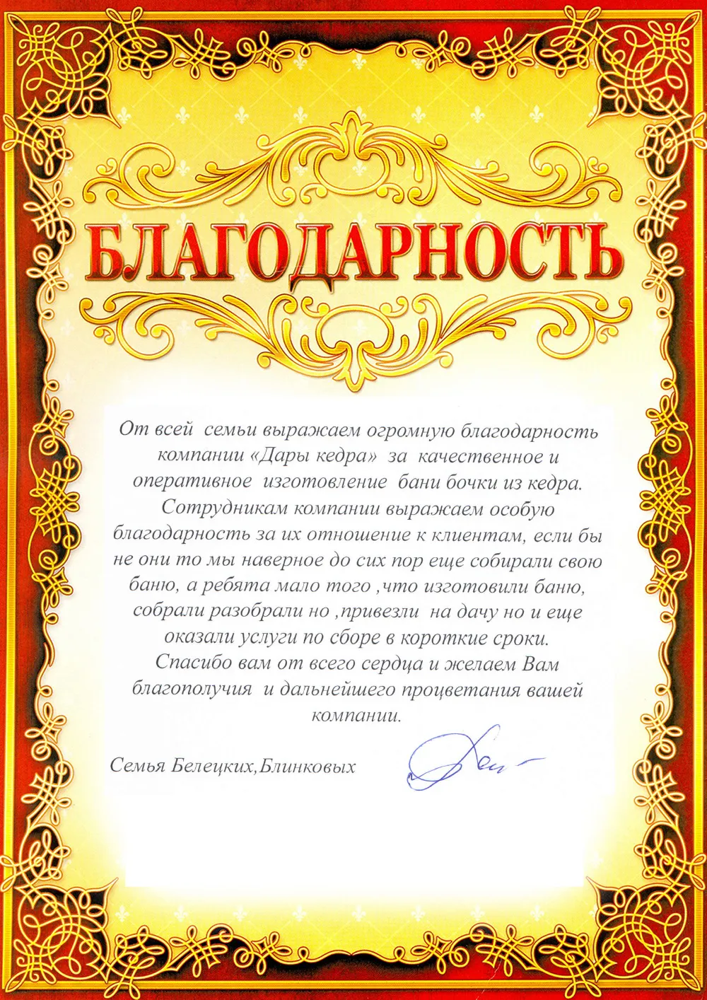 Летом 2019 года приобрела в Дарах Кедра баню-бочку, крашенную по моим требованиям. С заказом справились в срок, документальная часть меня порадовала - всё очень добросовестно, по договору. Доставка и установка, а также подключение бани было сделано сотрудниками компании. Спасибо!