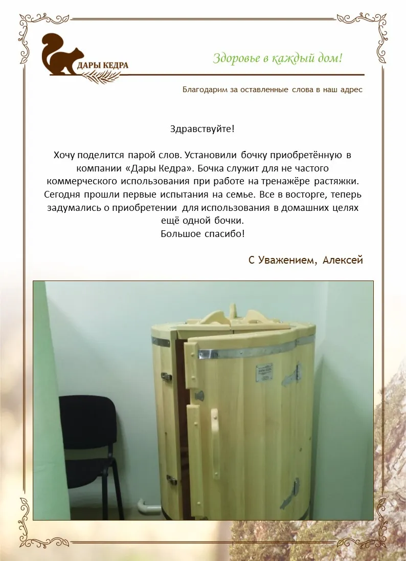 После изнурительных тренировок бочка «Дары Кедра» - настоящее спасение! Моя бочка с резьбой выглядит очень красиво! Практически каждый день пользуюсь после занятий, эффект есть, боли в мышцах уходят. Рекомендую!