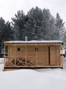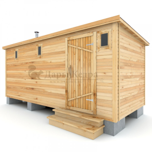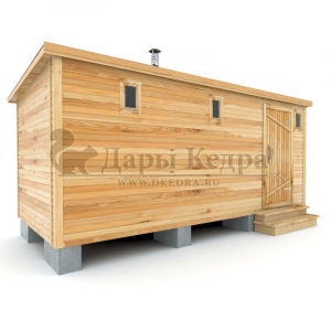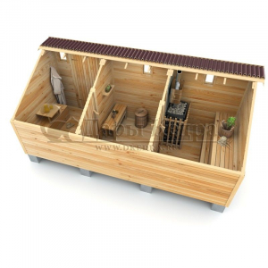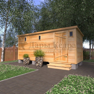 Это классическая прямоугольная модель бани с тремя отделениями: предбанником, моечной и парилкой. Для удобства пользования предбанник оснащен лавочкой и вешалкой. В моечной находится лавка и полочка из кедра. Парилка оборудована двухуровневым открытым полком и печью. Время растопки такой бани не превышает 30 минут. Каркасно-щитовую баню можно заказать как в готовом, так и в разборном варианте. В разборной модели готовые щиты из кедра быстро собираются в полноценное строение, что также позволяет исключить лишний строительный мусор. Такая баня не требует полноценный фундамент, поэтому при необходимости ее можно перенести в другое место.